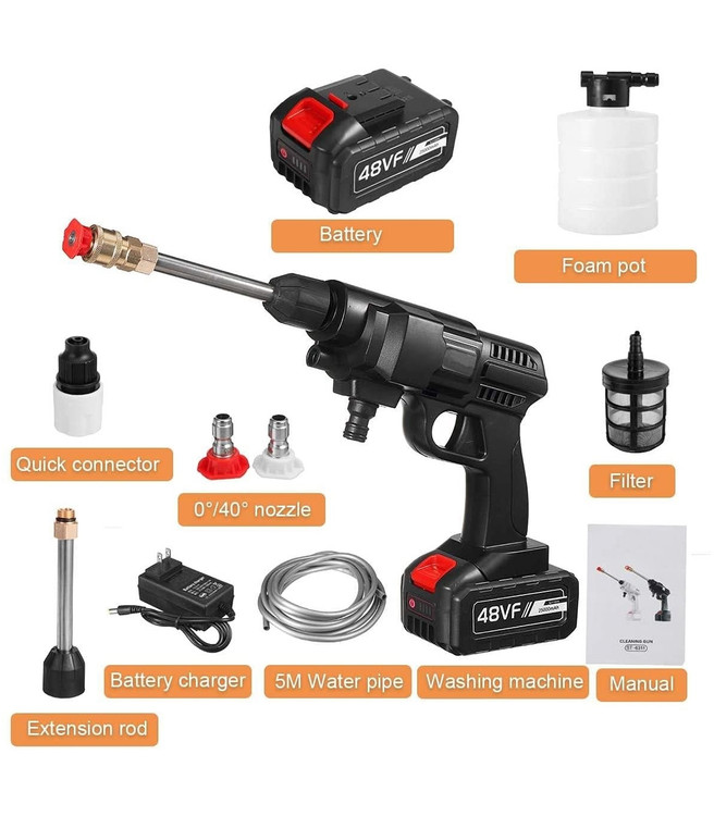 (یه مدل با کیف حمل و یه مدل بدون کیف به انتخاب شما)، گان بلند، شلنگ ورودی و دو عدد اتصالات ورودی و فیلتر, مخزن پاشش کف (مواد شوینده)